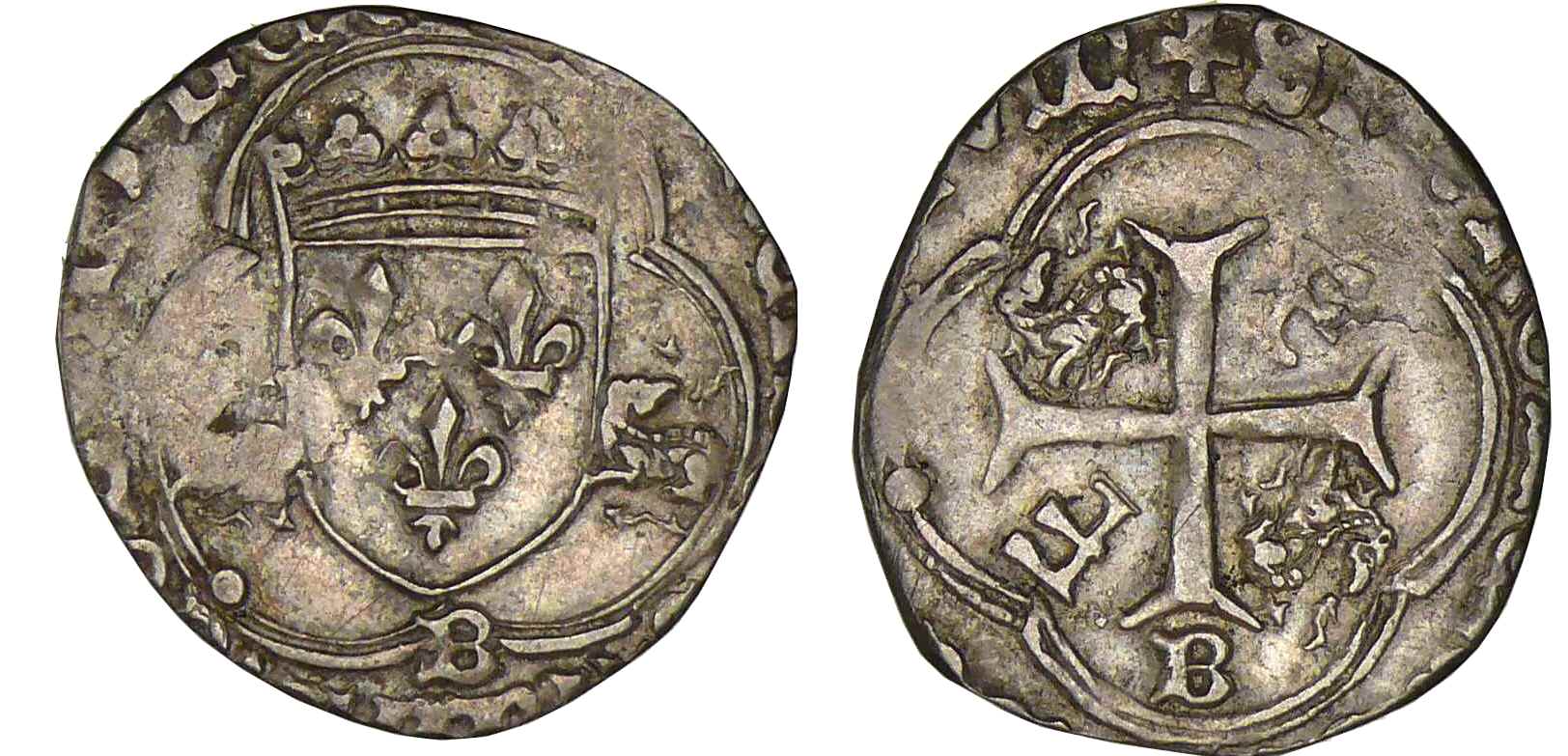 Avers : A/ + FRANCISCVS FRANCORVM REX. Ecu de France couronné et accosté de deux salamandres, dans un trilobe. Lettre d’atelier à la pointe de l’écu.