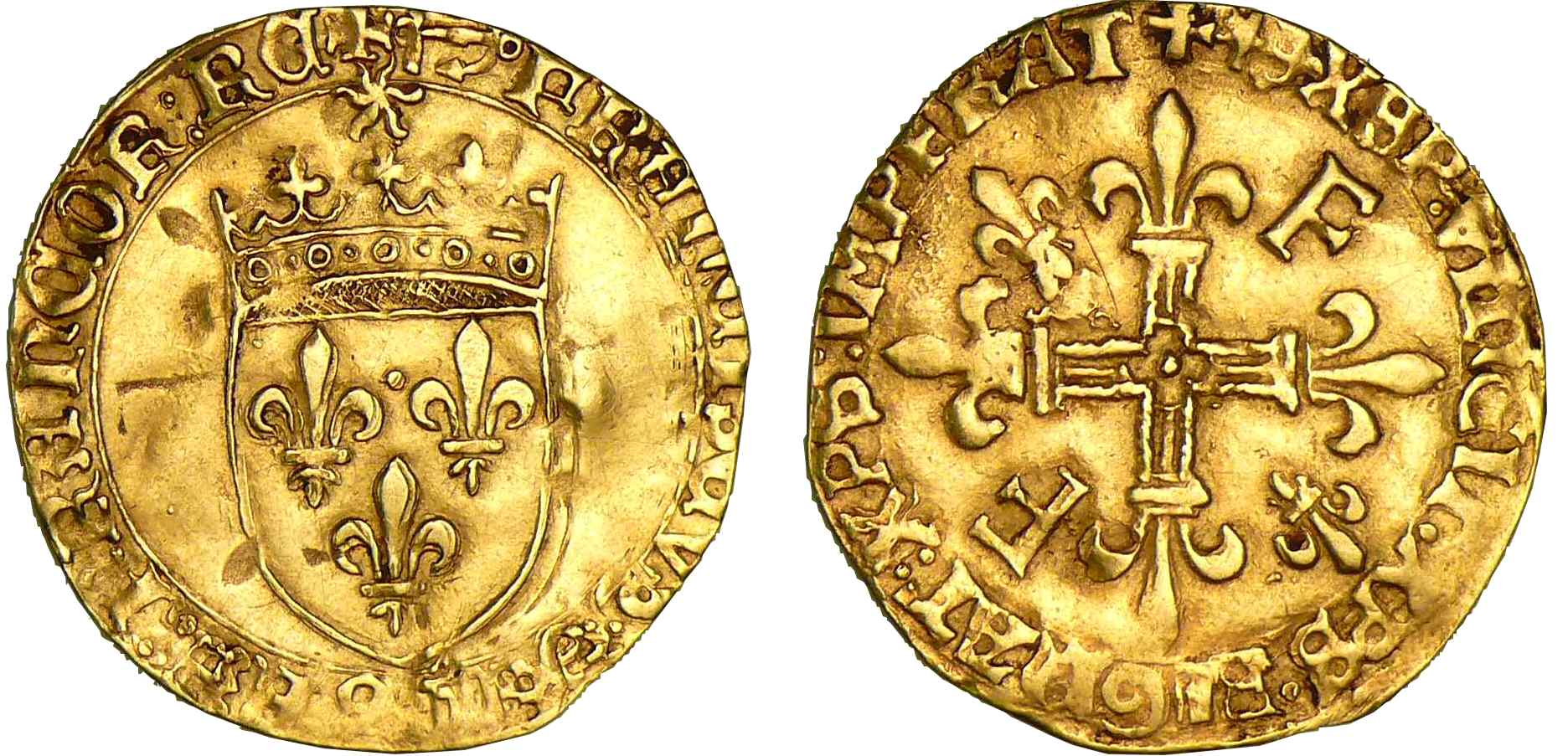 Revers : R/ + XPS. VINCIT. XPS. REGNAT (Mm) XPS. IMPERAT. Croix fleurdelisée avec quadrilobe en cœur, cantonnée d’un lis aux 1er et 4ème, d’un F aux 2ème et 3ème.