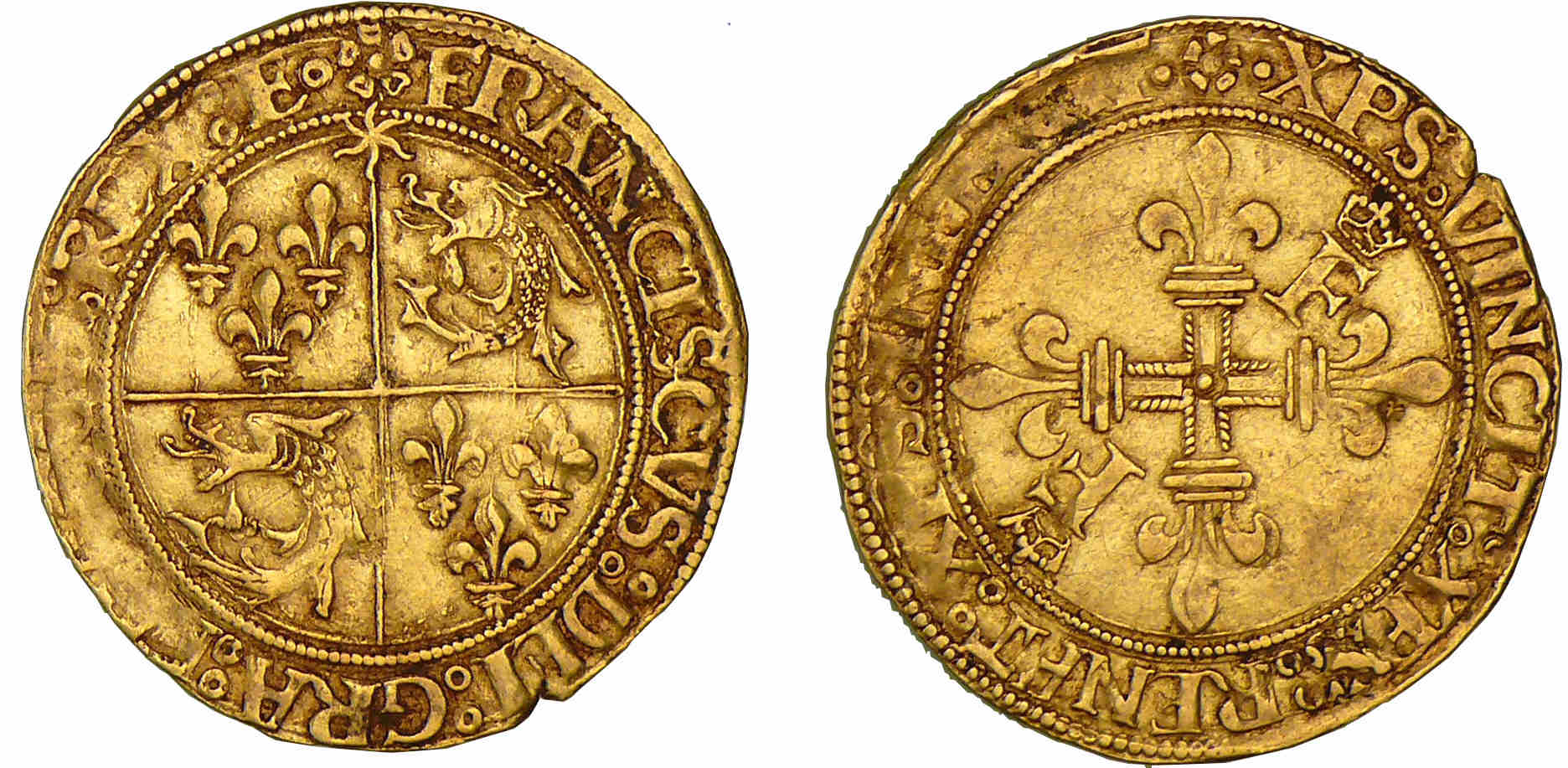 Avers : A/ (rose) FRANCISCVS : DEI : GRA : FRACOR : REX :E. Champ écartelé surmonté d’un soleil, aux 1er et 4ème de France, aux 2ème et 3ème de Dauphiné.