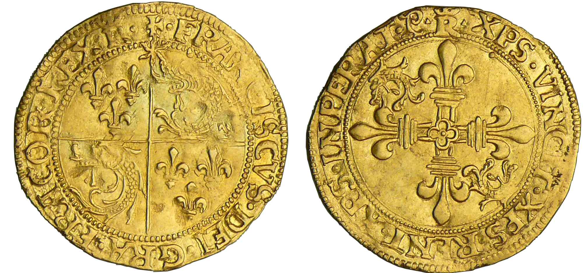 Avers : A/ +. FRANCISCVS. DEI. GRA. FRACOR. REX. Champ écartelé surmonté d’un soleil aux 1er et 4ème de France, aux 2ème et 3ème de Dauphiné.