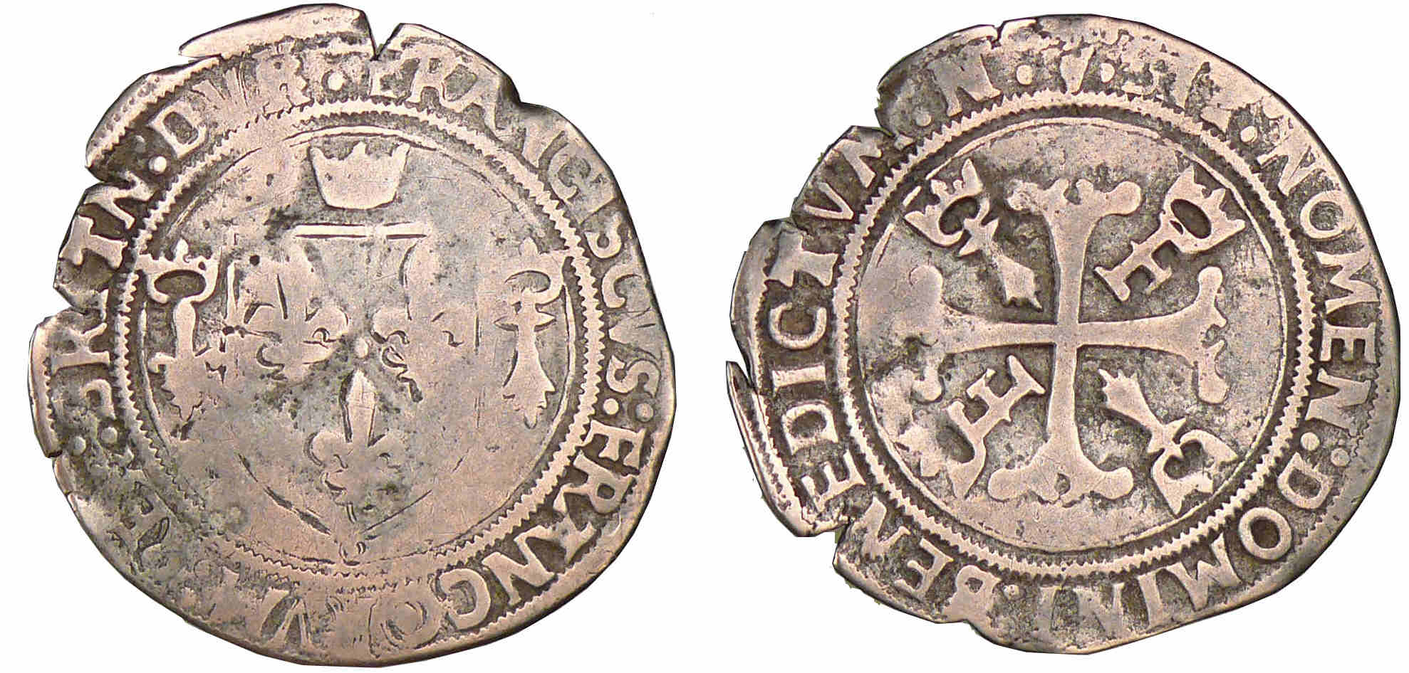 Avers : A/ FRANCISCVS FRANCOR REX BRITAN DVX N. Ecu de France couronné, accosté d’un F couronné et d’une moucheture d’hermine couronnée.