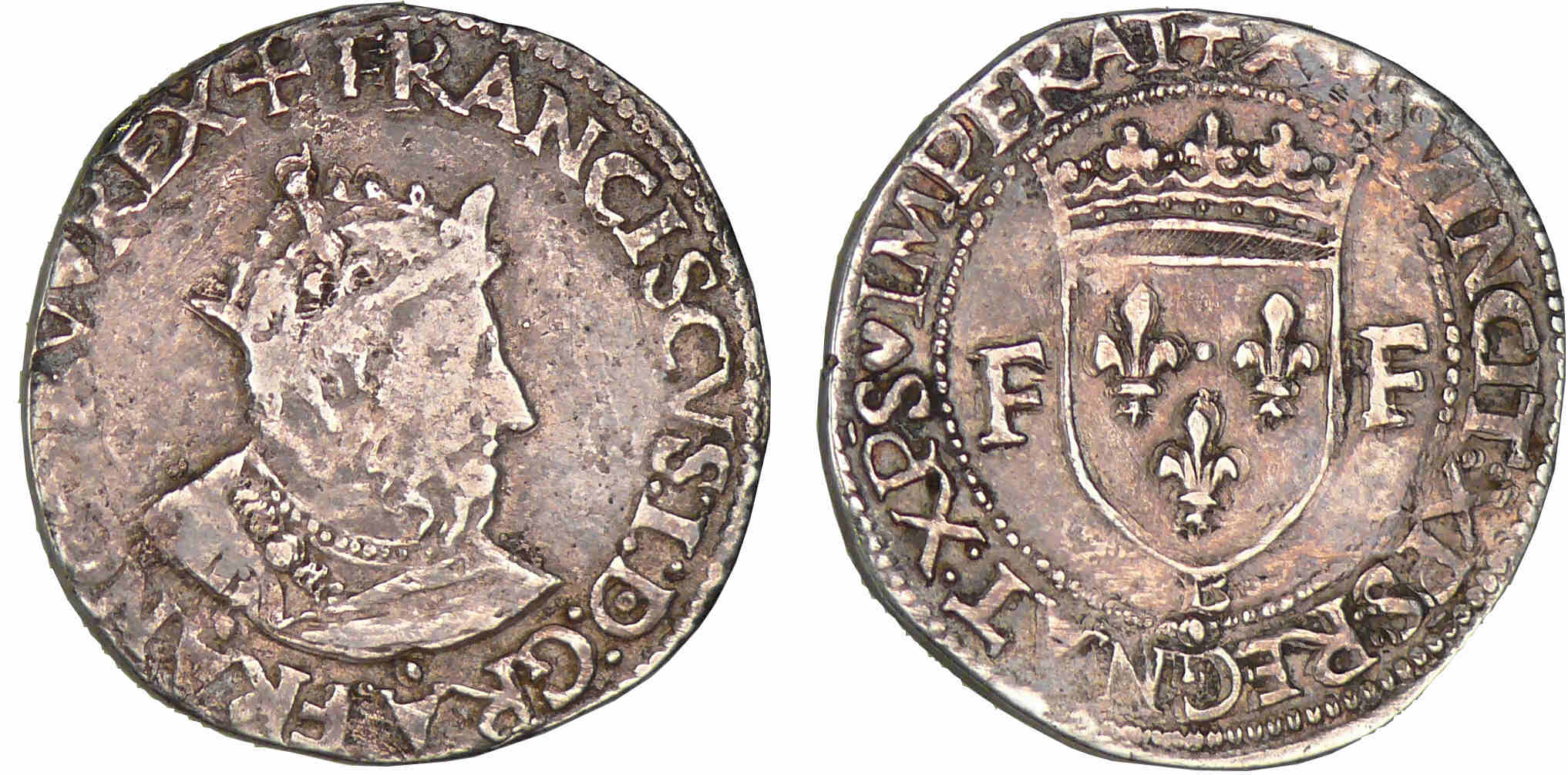 Avers : A/ + FRANCISCVS: I: D: GRA: FRANCOV:(cœur). REX. Buste de François 1er à droite, barbu et cuirassé avec le collier de l’ordre de Saint-Michel et une couronne fermée.