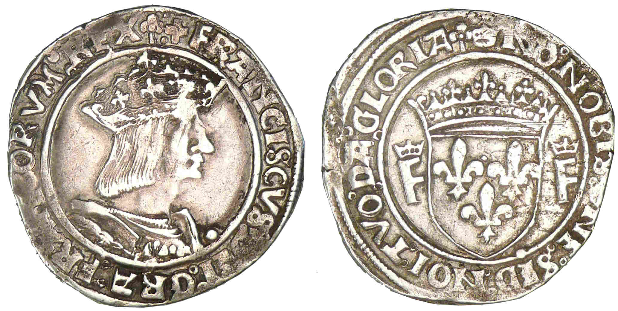 Avers : A/ + FRANCISCVS: DEI: GRA: FRANCORVM: REX: (trèfle). Buste à droite coiffé d’une couronne ouverte sur un chaperon.