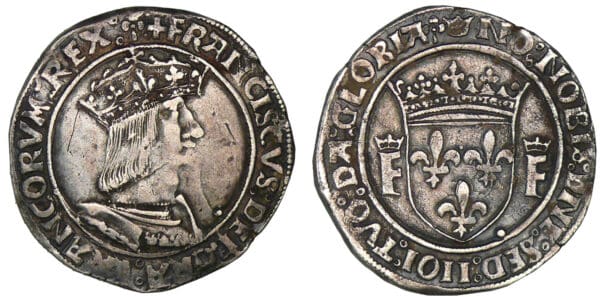A/ + FRANCISCVS: DEI: GRA: FRANCORVM: REX: (trèfle). Buste du roi à droite, coiffé d’une couronne ouverte sur un chaperon.