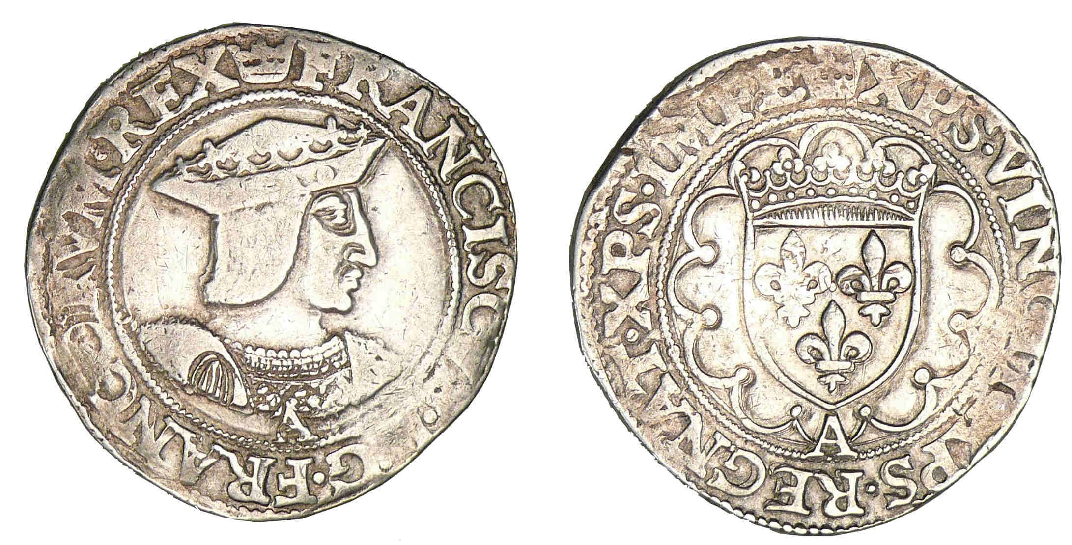 A/ (couronnelle) FRANCISCVS : I D : GRA : FRACOR : REX. Buste du roi à droite coiffé d’une couronne ouverte sur un chaperon.