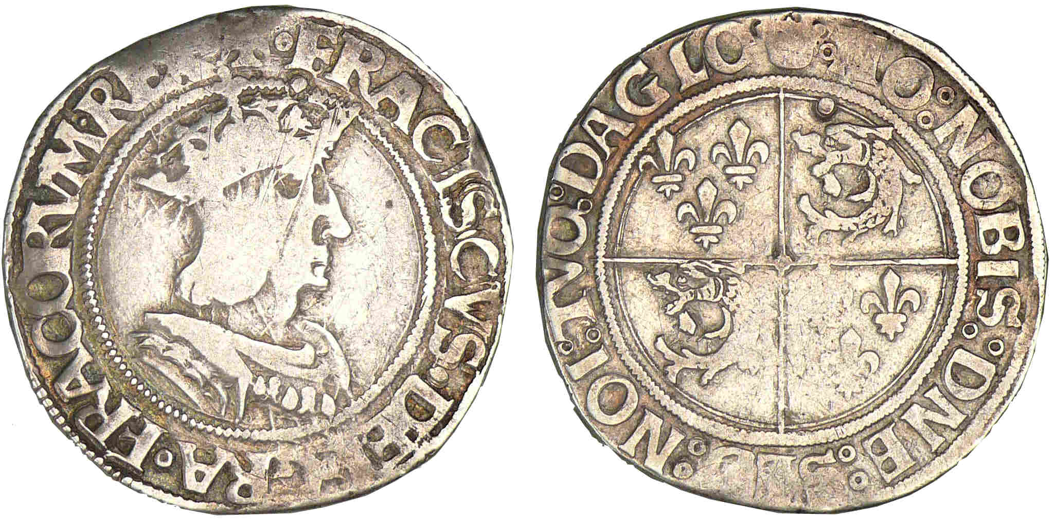 Avers : A/ FRACISCVS• DEI• GRA• FRACORVM• REX• Buste à droite coiffé d’une couronne fermée sur un chaperon.