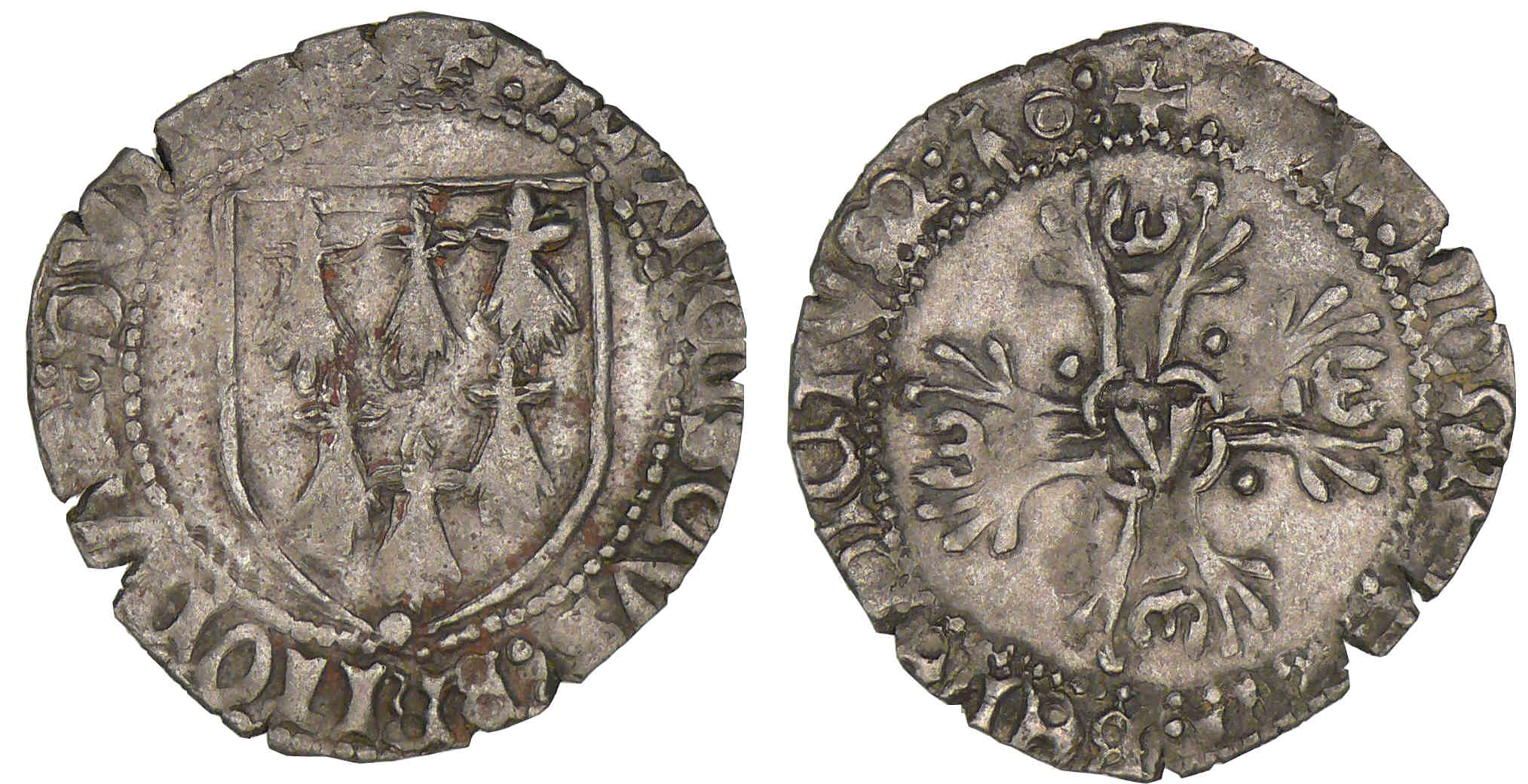 Revers : R/ + :SIT: noman: DnI: BanaDI6TVm: Ç:~: – Croix feuillue, un V en cœur.
