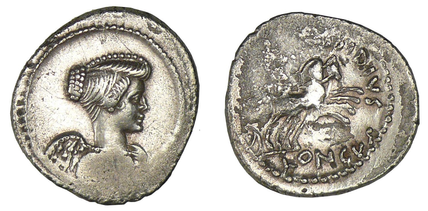 Observation : Monnaie d’une grande rareté. C’est le seul denier frappé au nom de la seconde femme de Marc Antoine. Petite oxydation sur la Victoire.