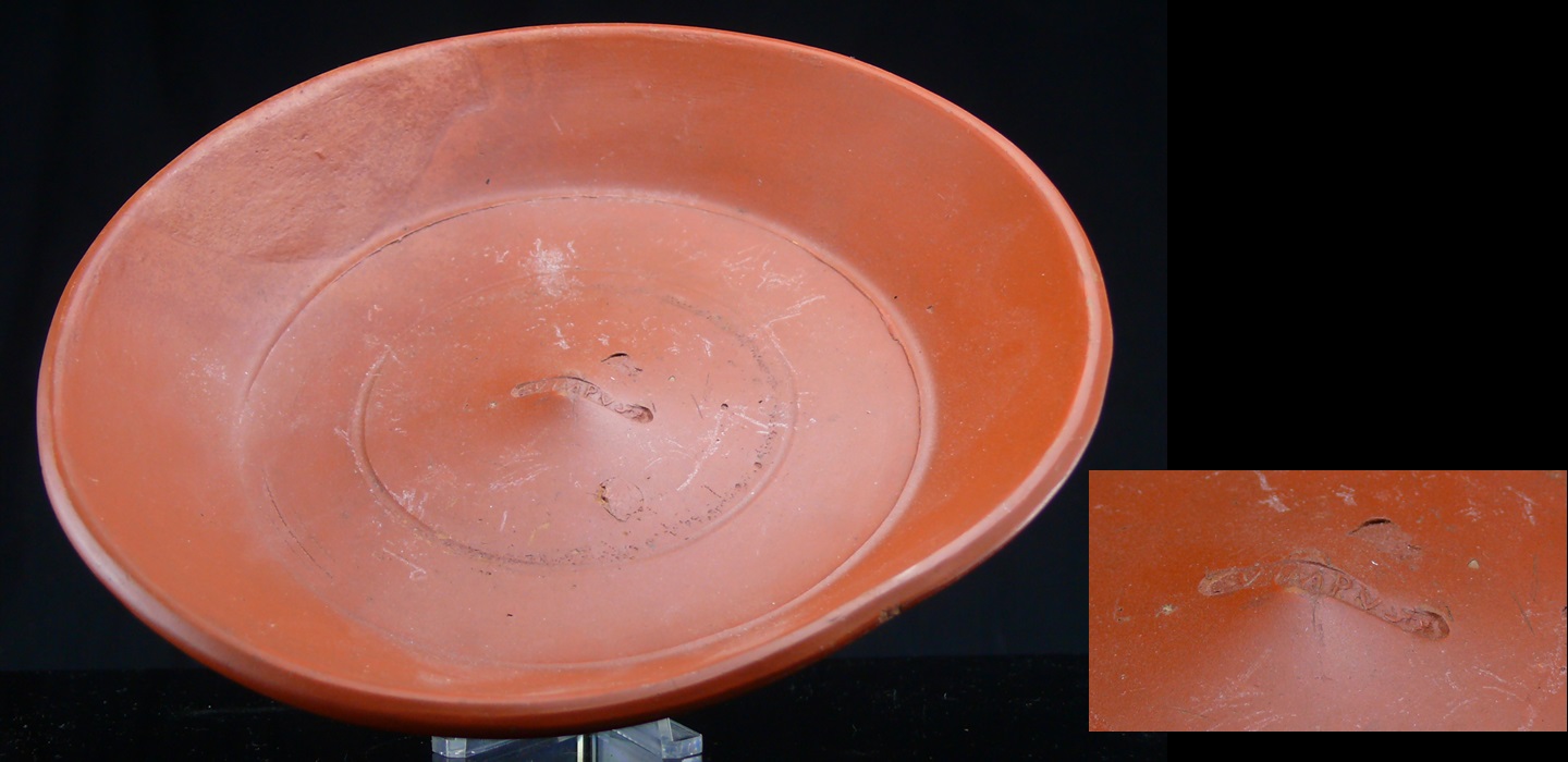 Belle assiette en sigillée de couleur rouge portant une estampille VIMPUS entre 2 feuilles, atelier de Blickweiler (Sarre). Trace de restauration sur le bord de l’objet. 190*45 mm.