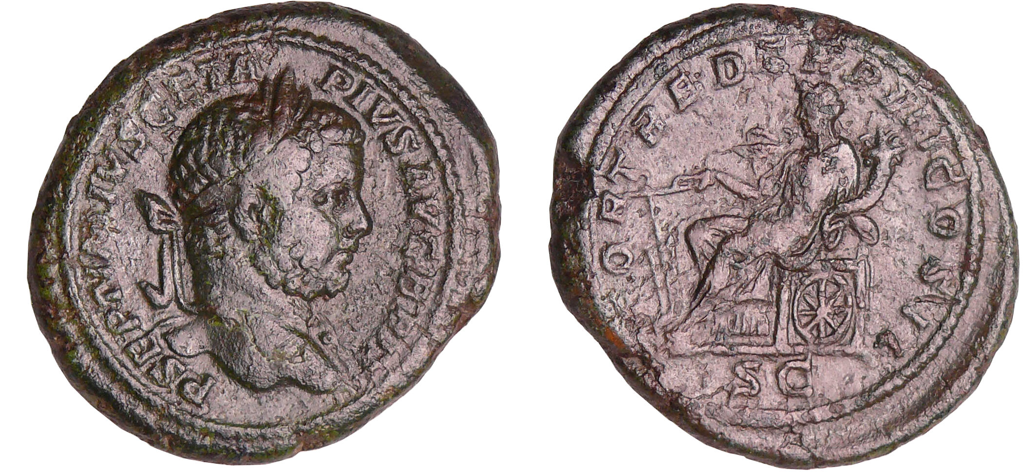R/ FORT RED TR P III COS II // SC. La Fortune assise à gauche, tenant un gouvernail et une corne d’abondance. Sous le siège, une roue.