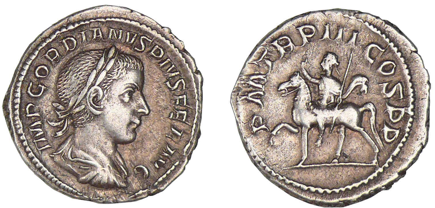 R/ P M TR P III COS P P. Gordien chevauchant à droite, levant la main droite et tenant un sceptre.