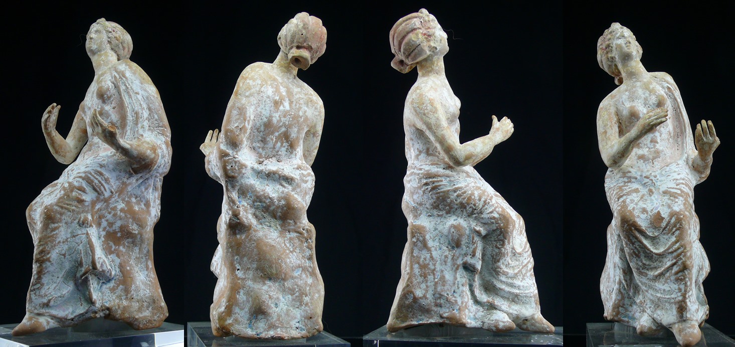 Avers : Très belle et grande statuette en terre cuite ocre, représentant une divinité assise, peut être Vénus. La déesse est vêtue d’un grand drapé qui lui couvre une épaule, les hanches et les jambes et porte un diadème dans les cheveux. Elle a les bras pliés comme si elle portait quelque chose. Un très beau reste de polychromie blanche sur l’ensemble de l’objet. A noter qu’il manque un pouce et la présence de quelques autres infimes manques. 210 mm.