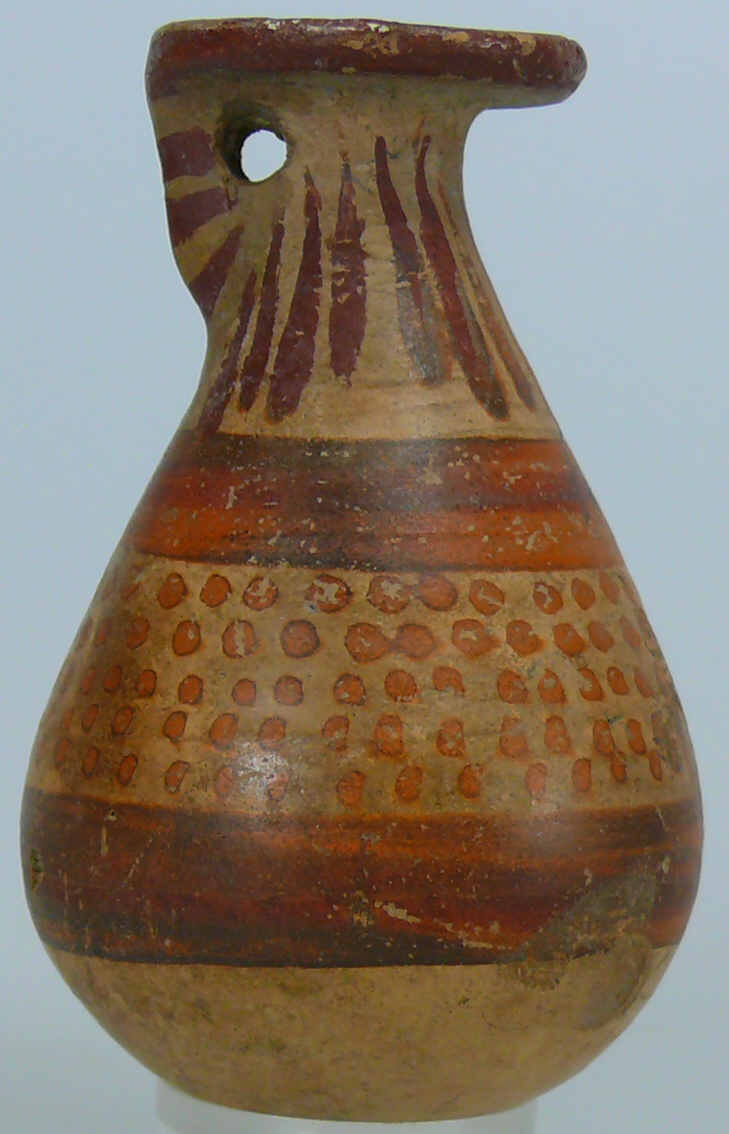 Joli petit aribale en terre cuite avec toute son engobe marron. Petit manque sur le col. 70 mm.