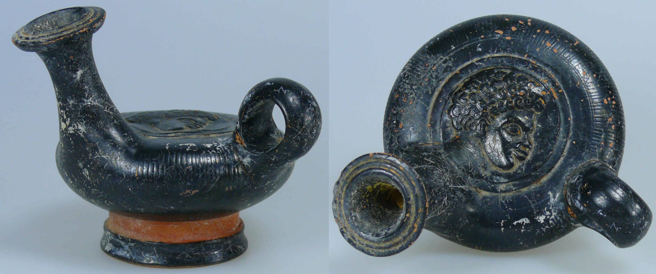 Grand et très beau guttus en terre cuite noire vernissée. Il est orné en son centre d’une tête négroïde. 120 mm.