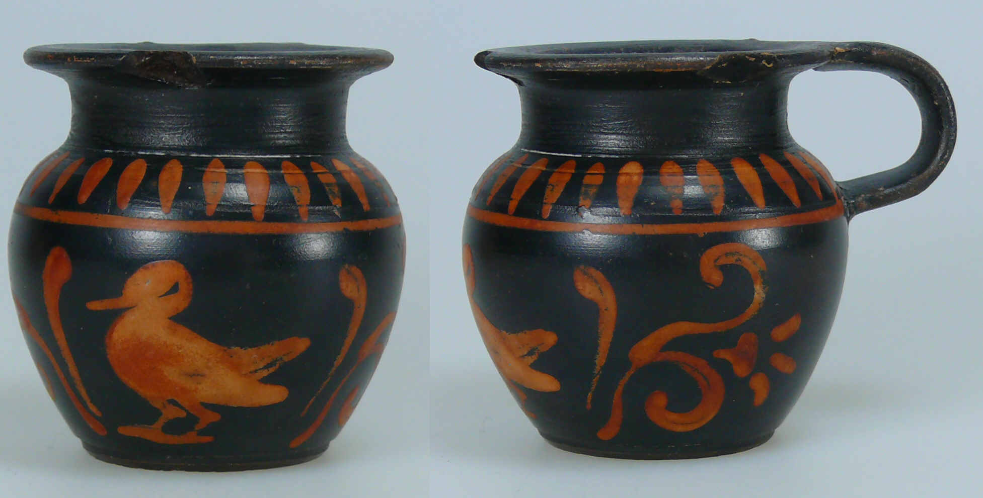 Joli vase à engobe noire orné d’un décor représentant un oiseau entre deux fleurs. 58 mm.