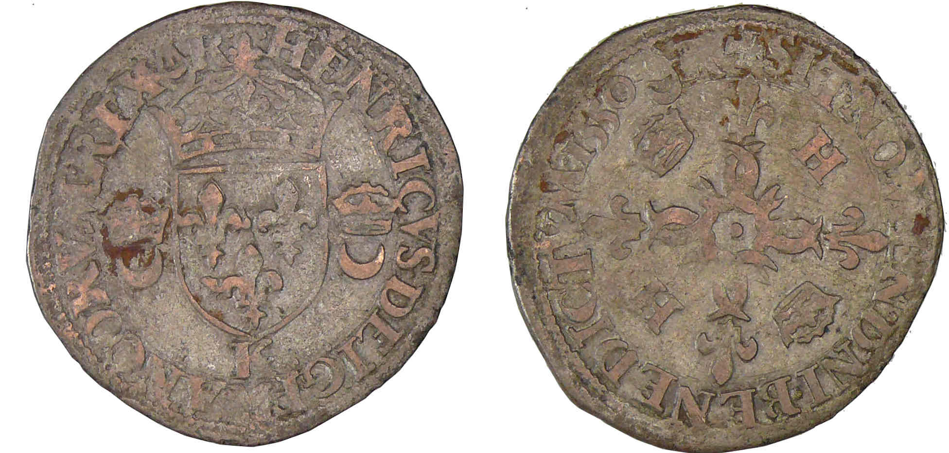 A/ HENRICVS 2 DEI G FRANCOR REX. Ecu de France accosté de deux croissants couronnés. Lettre d’atelier à la pointe de l’écu.