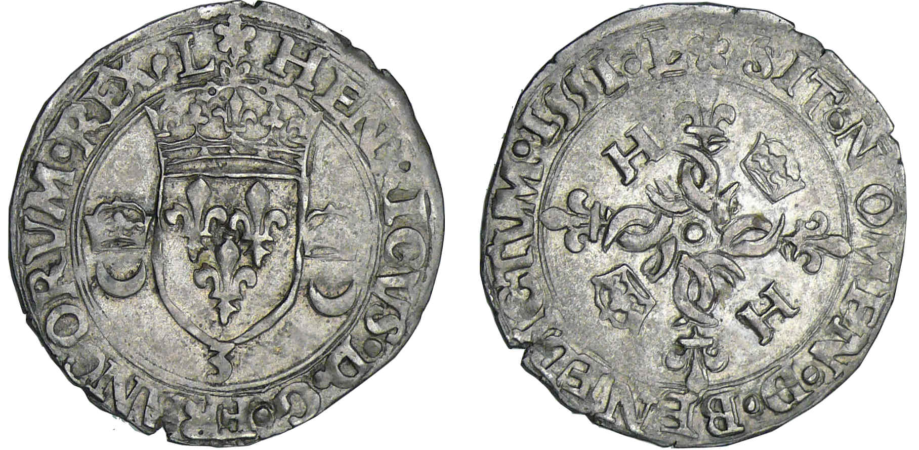 Avers : A/ HENRICVS 2 DEI G FRANCOR REX. Ecu de France accosté de deux croissants couronnés. Lettre d’atelier à la pointe de l’écu.