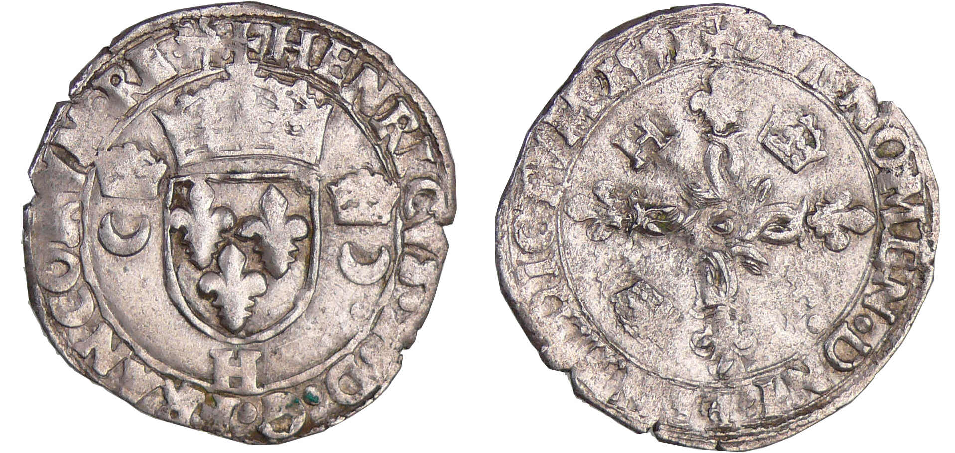 A/ HENRICVS 2 DEI G FRANCOR REX. Ecu de France accosté de deux croissants couronnés. Lettre d’atelier à la pointe de l’écu.