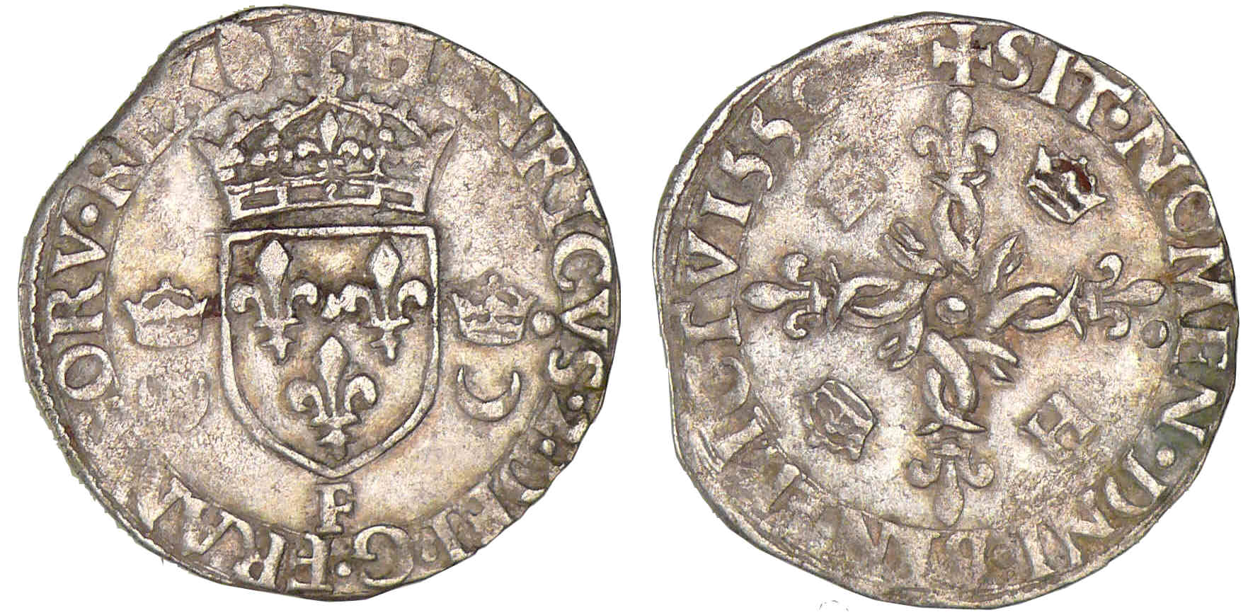 Avers : Henri II (1547-1559). A/ HENRICVS 2 DEI G FRANCOR REX. Ecu de France accosté de deux croissants couronnés. Lettre d’atelier à la pointe de l’écu.