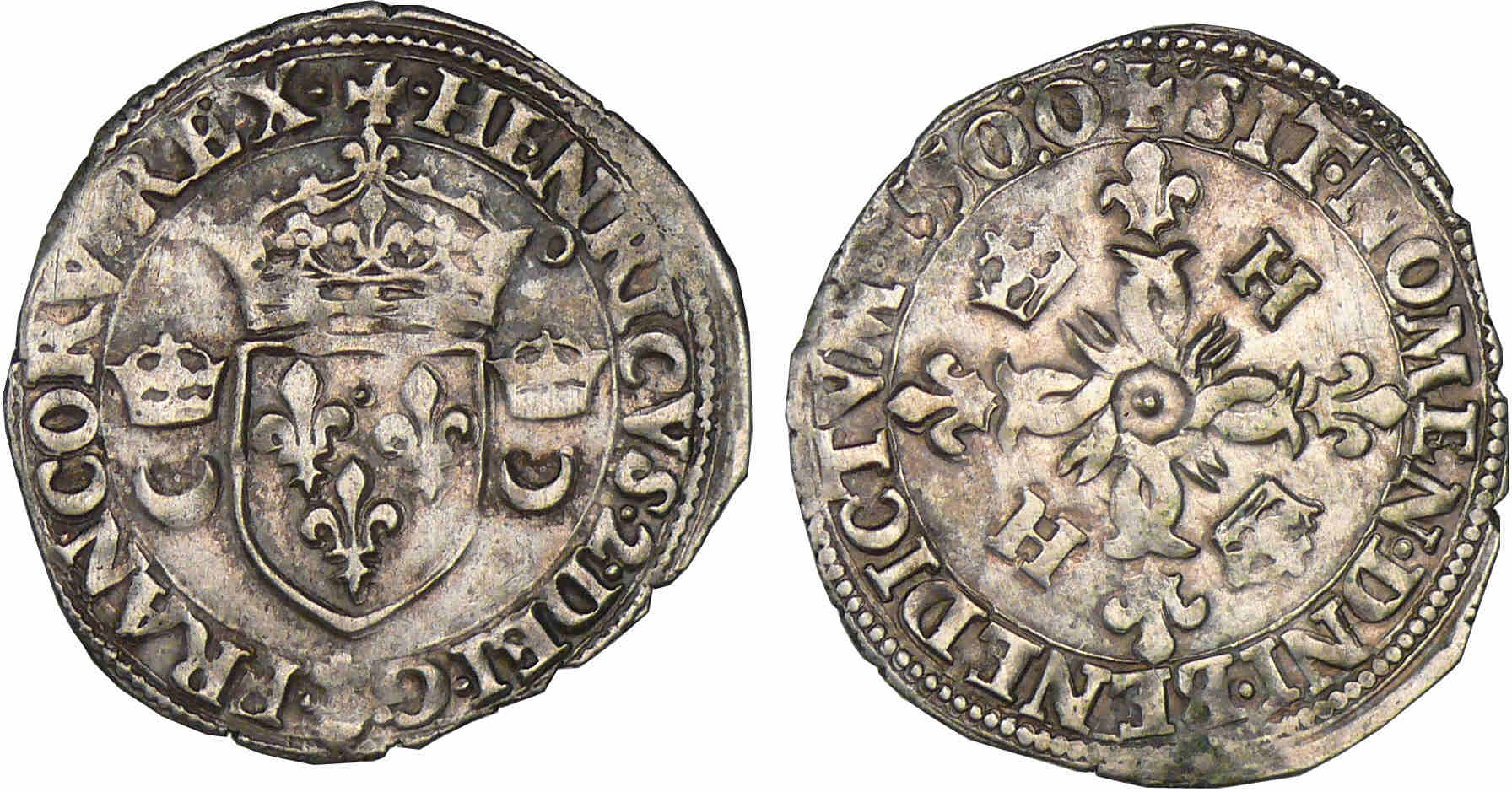 Avers : A/ HENRICVS 2 DEI G FRANCOR REX. Ecu de France accosté de deux croissants couronnés. Lettre d’atelier à la pointe de l’écu.