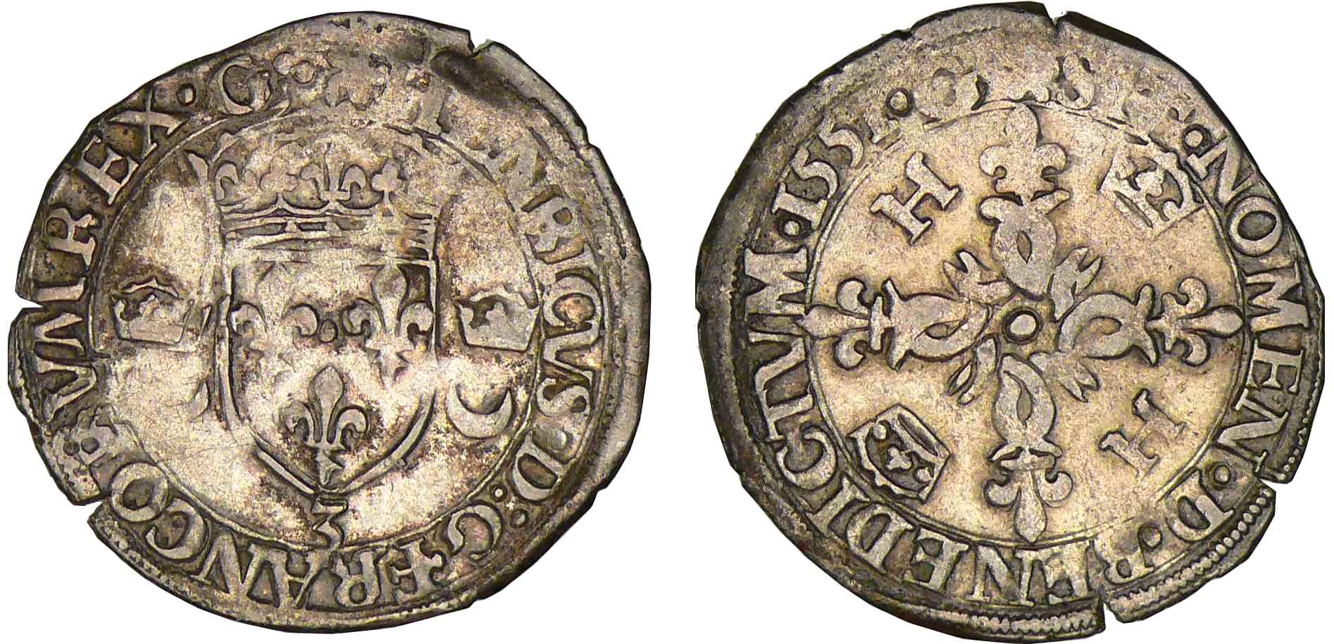 A/ HENRICVS 2 DEI G FRANCOR REX. Ecu de France accosté de deux croissants couronnés. Lettre d’atelier à la pointe de l’écu.