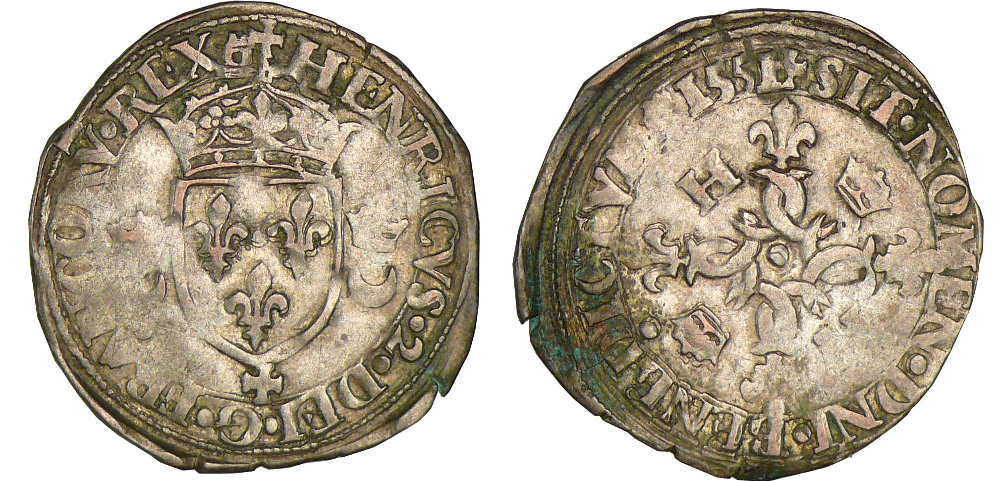 A/ HENRICVS 2 DEI G FRANCOR REX. Ecu de France accosté de deux croissants couronnés. Lettre d’atelier à la pointe de l’écu.