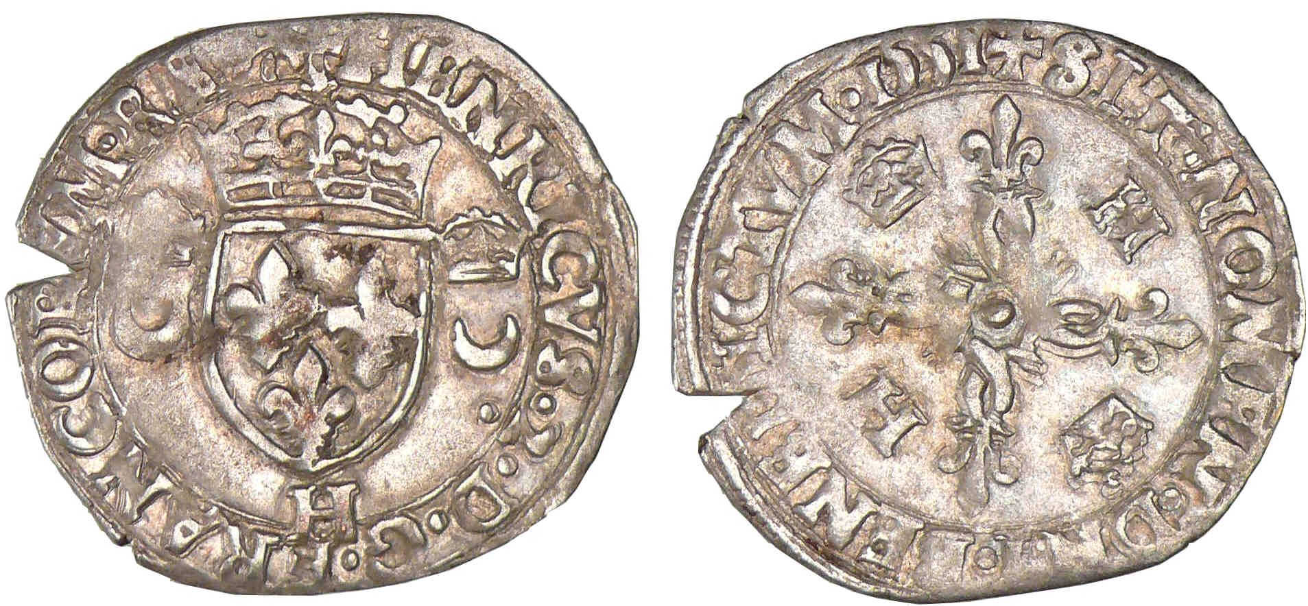 Avers : Henri II (1547-1559). A/ HENRICVS 2 DEI G FRANCOR REX. Ecu de France accosté de deux croissants couronnés. Lettre d’atelier à la pointe de l’écu.