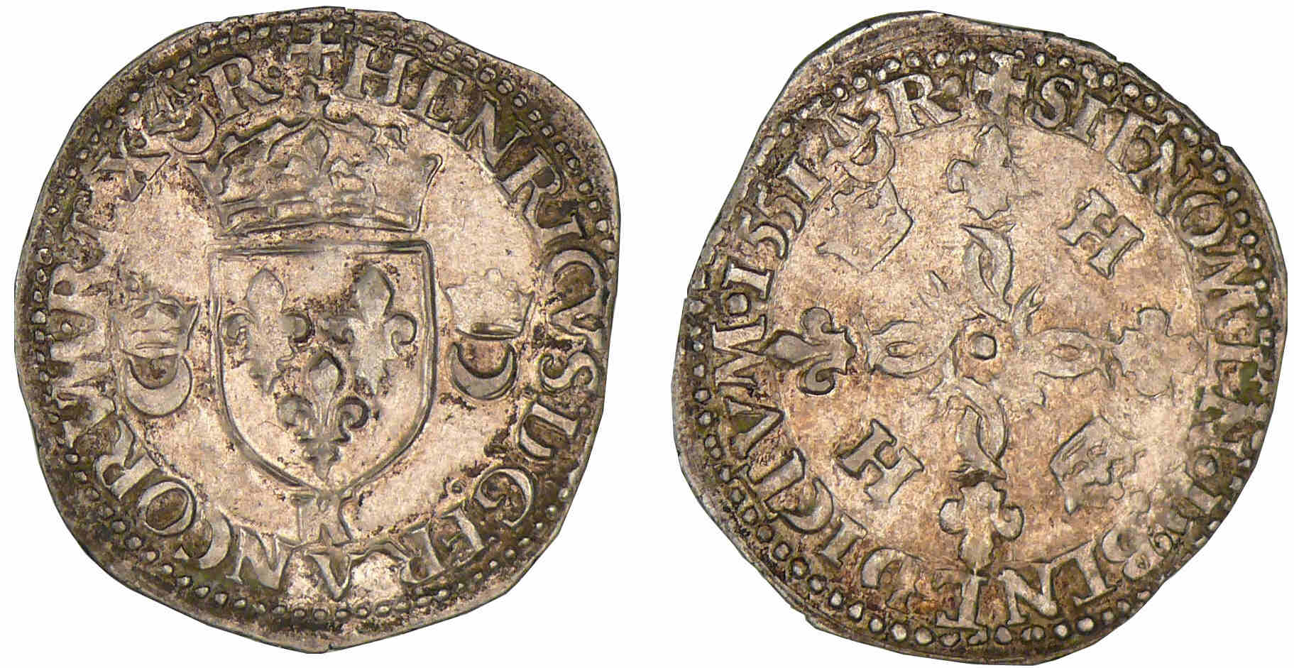 A/ HENRICVS 2 DEI G FRANCOR REX. Ecu de France accosté de deux croissants couronnés. Lettre d’atelier à la pointe de l’écu.