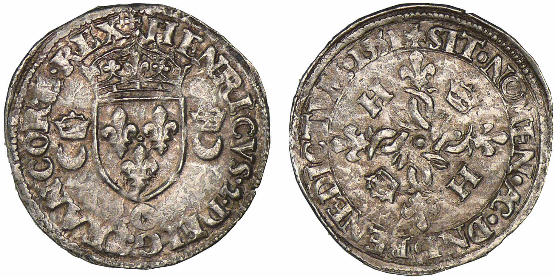 A/ HENRICVS 2 DEI G FRANCOR REX. Ecu de France accosté de deux croissants couronnés. Lettre d’atelier à la pointe de l’écu.