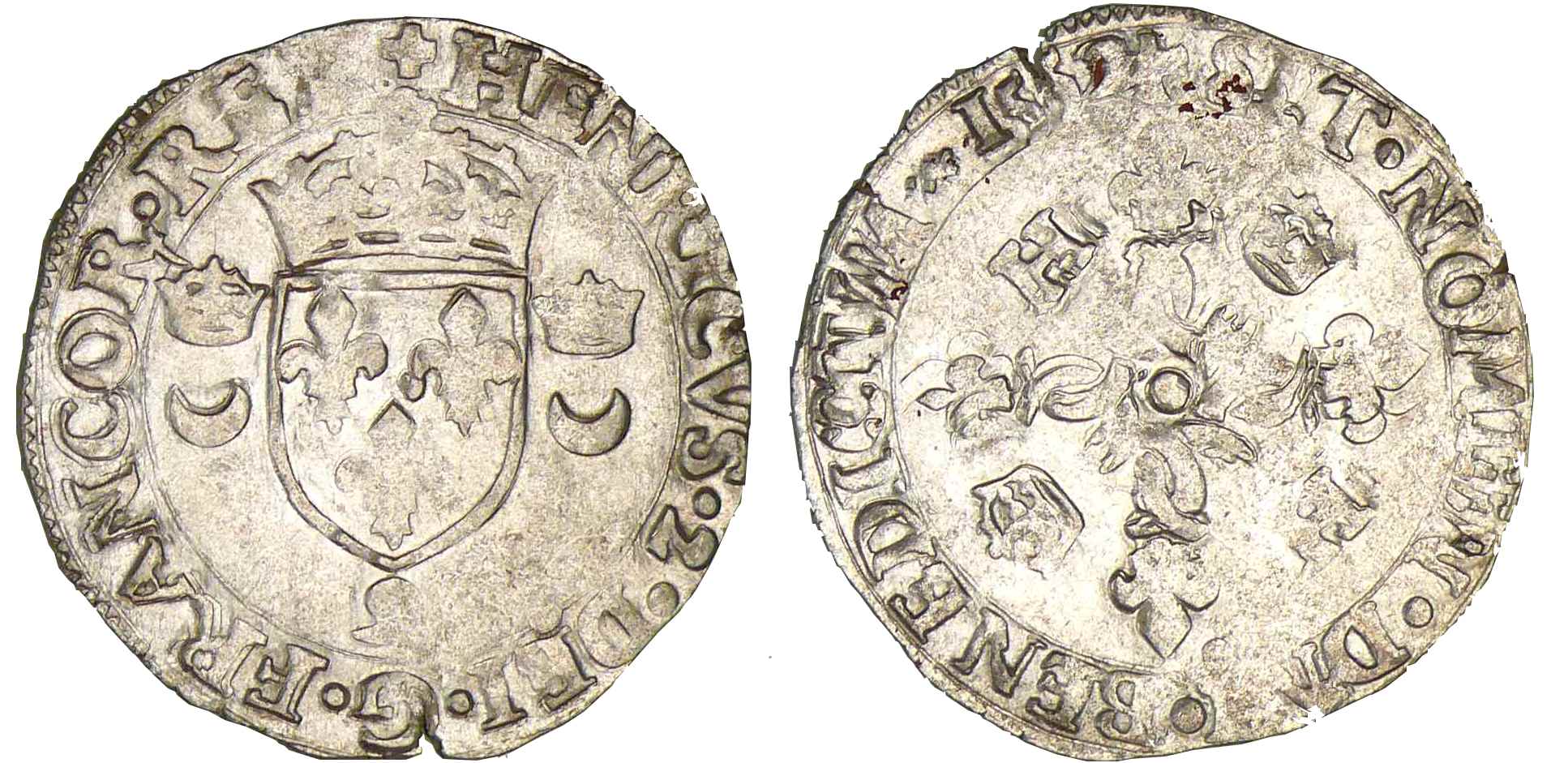 A/ HENRICVS 2 DEI G FRANCOR REX. Ecu de France accosté de deux croissants couronnés. Lettre d’atelier à la pointe de l’écu.