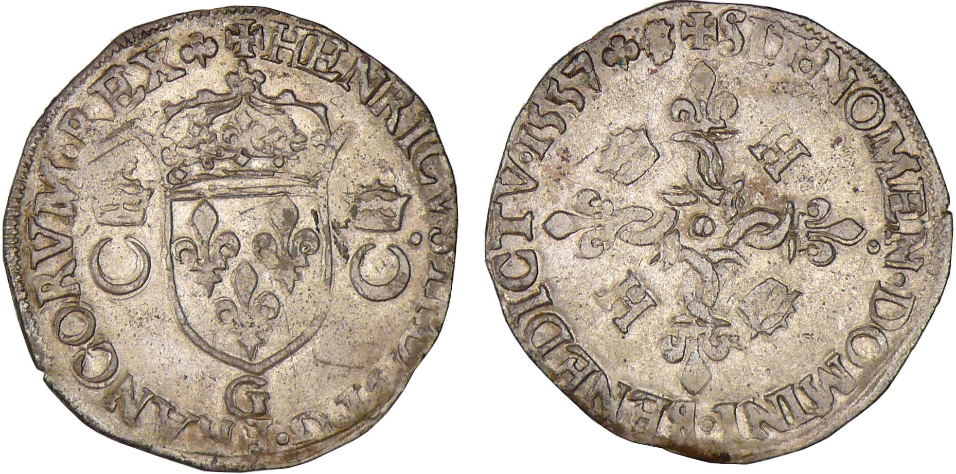 Avers : A/ HENRICVS 2 DEI G FRANCOR REX. Ecu de France accosté de deux croissants couronnés. Lettre d’atelier à la pointe de l’écu.
