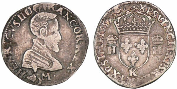 Revers : R/ + XPS. VINCIT. XPS. REGNAT. XPS. IMP. Ecu de France couronné et accosté de H couronnés. Lettre d’atelier sous l’écu.