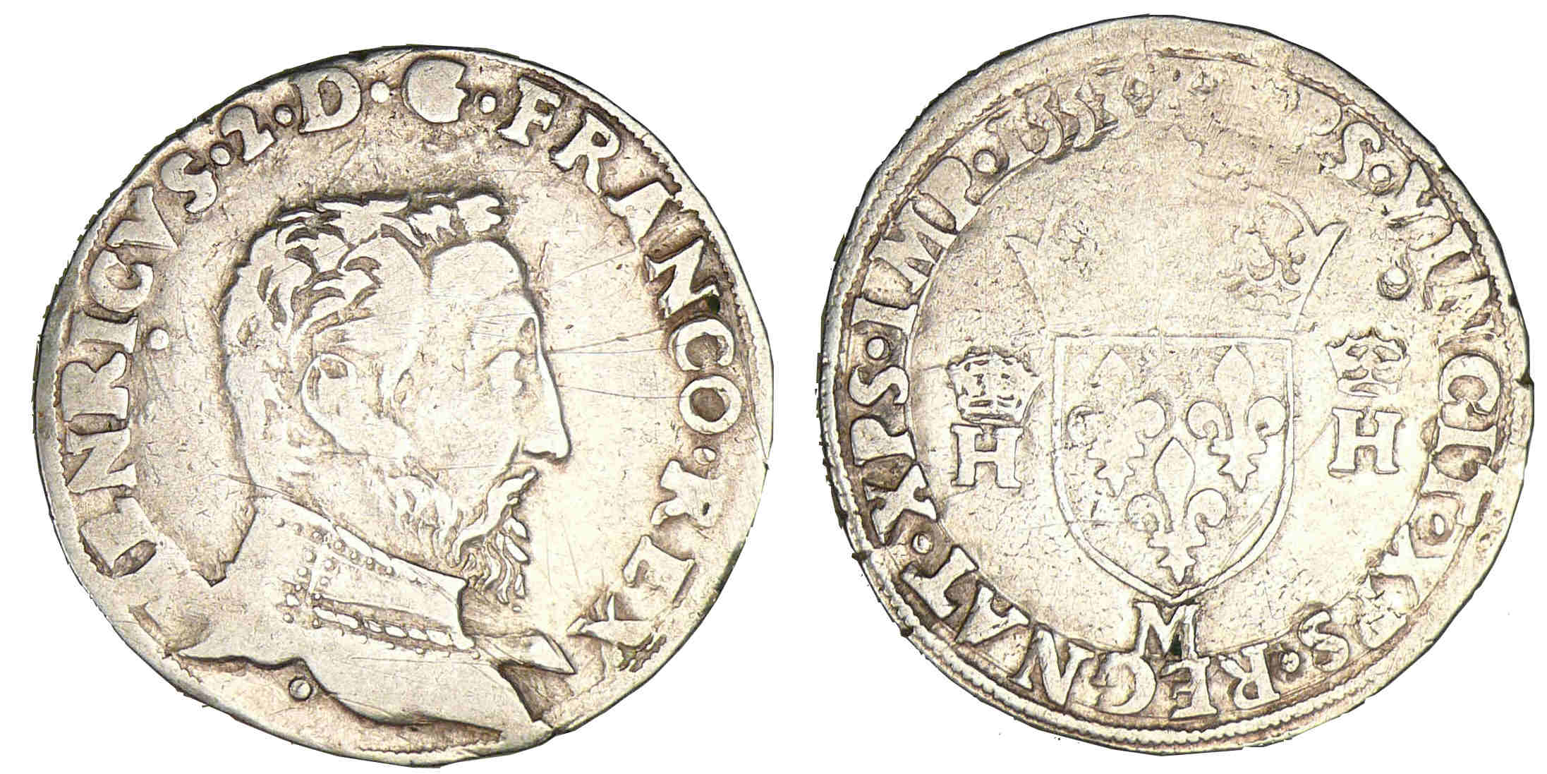 R/ + XPS. VINCIT. XPS. REGNAT. XPS. IMPE. (millésime). Ecu de France couronné et accosté de H couronné. Lettre d’atelier sous l’écu.