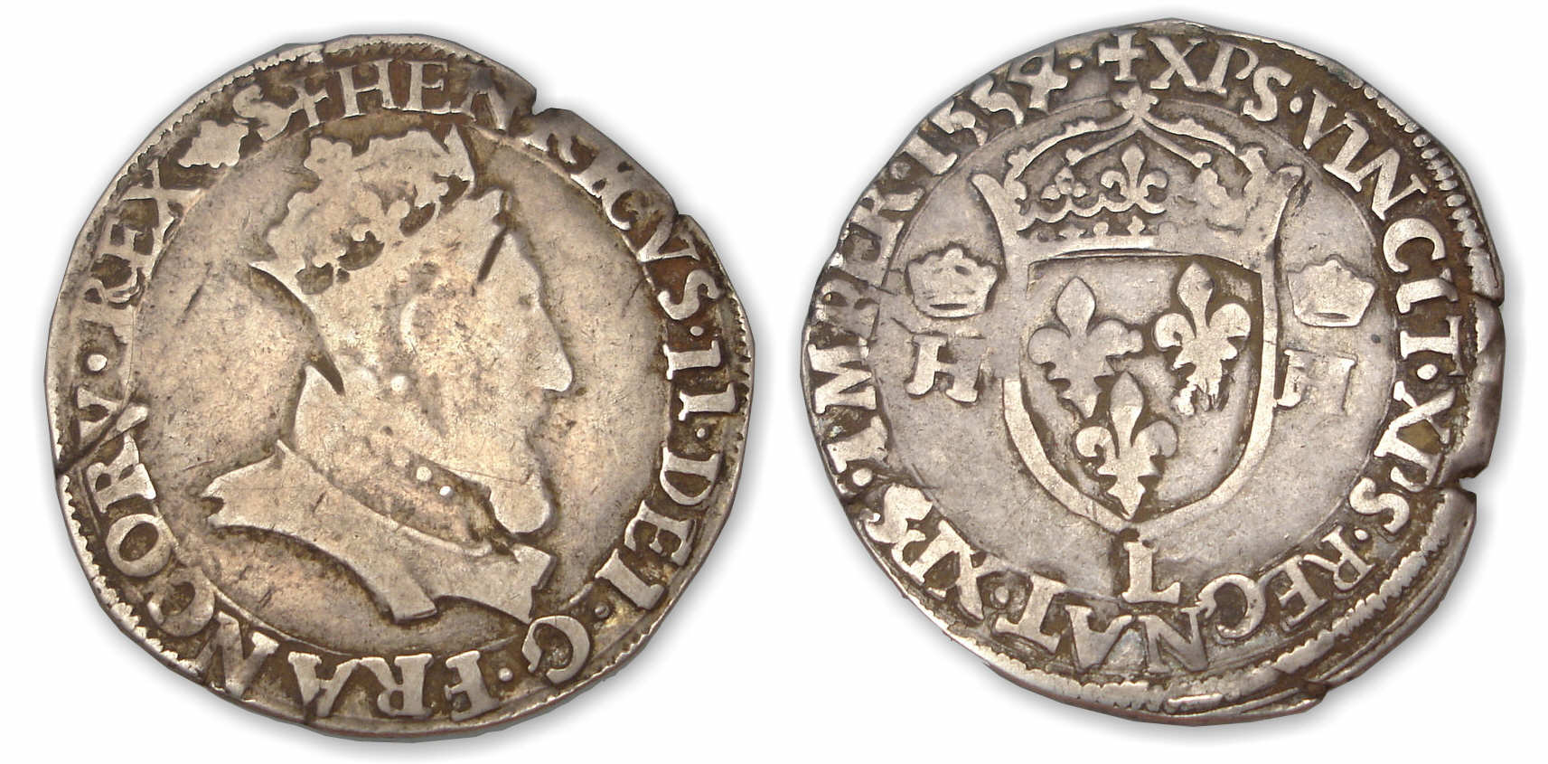 Avers : A/ + HENRICVS. II. DEI. G. FRANCORV. REX. ancre S. Buste couronné à droite.