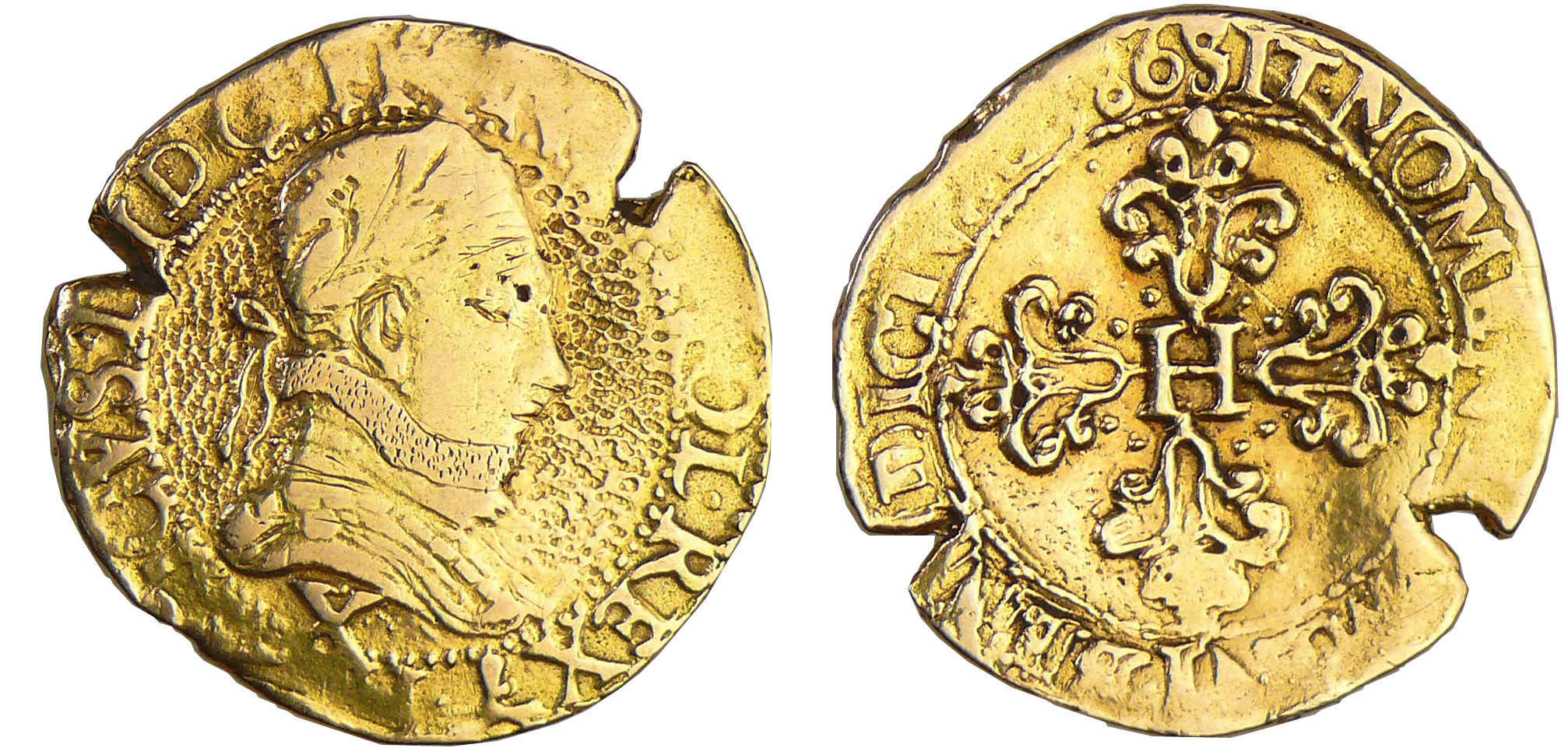 Avers : A/. HENRICVS. III. D. G. FRAN. ET. POL. REX Buste au col plat, lauré et cuirassé à droite. Lettre d’atelier sous le buste.