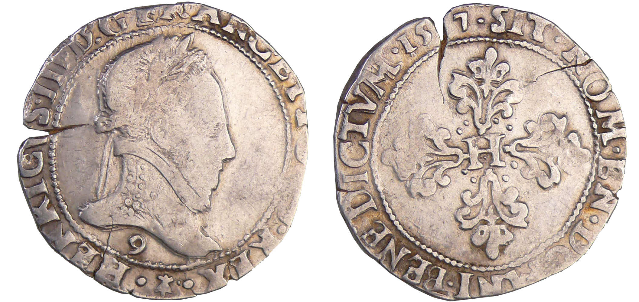 A/. HENRICVS. III. D. G. FRA. ET. POL. REX. Buste au col plat, lauré et cuirassé à droite. Lettre d’atelier sous le buste.