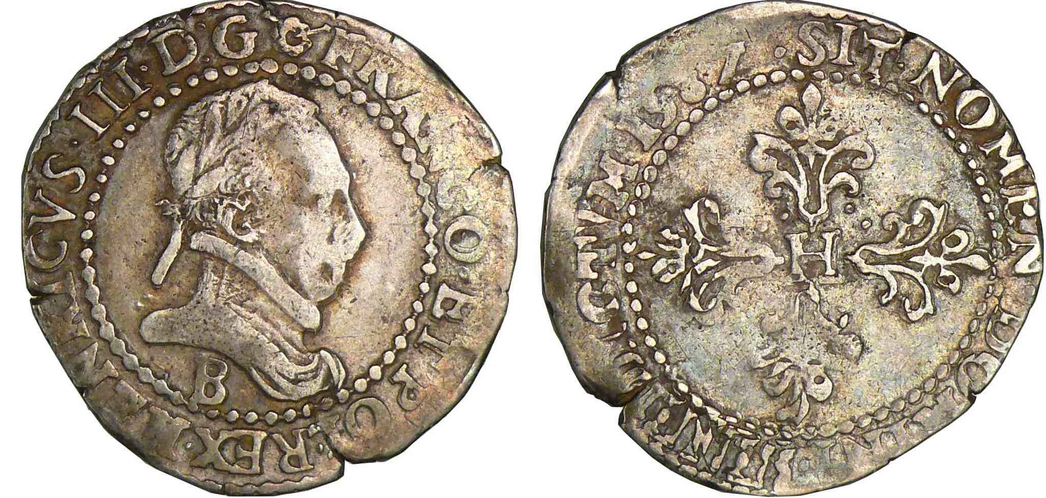 A/. HENRICVS. III. D. G. FRAN. ET. POL. REX. Buste au col plat, lauré et cuirassé à droite. Lettre d’atelier sous le buste.
