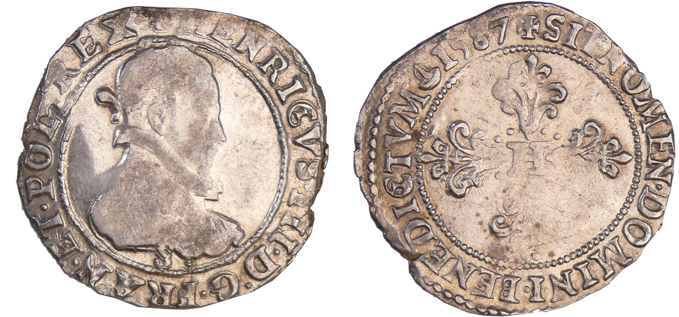 A/. HENRICVS. III. D. G. FRAN. ET. POL. REX Buste au col plat, lauré et cuirassé à droite. Lettre d’atelier sous le buste.