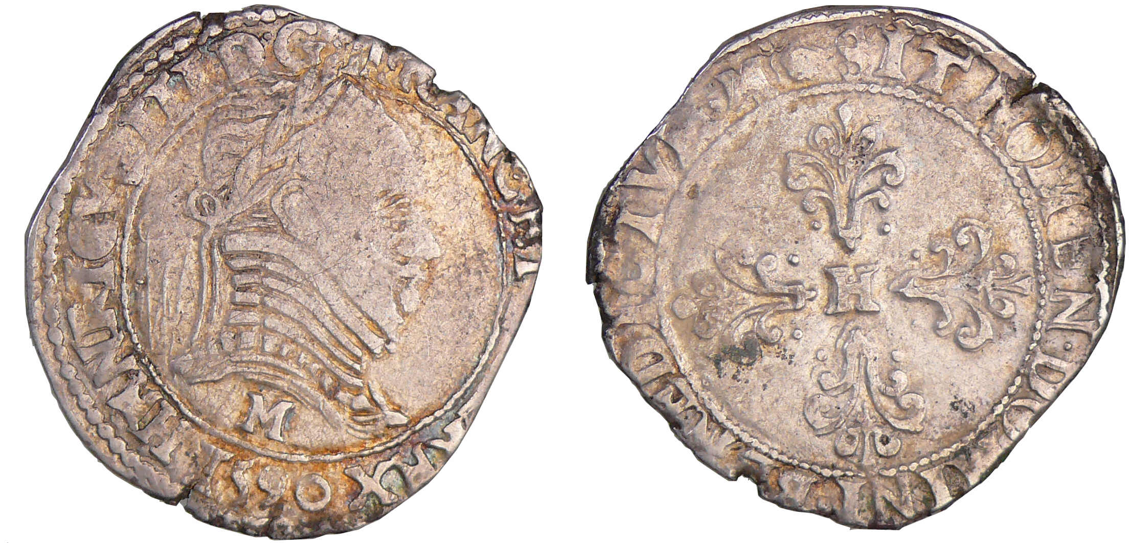 A/. HENRICVS. III. D. G. FRA. ET. POL. REX. Buste au col plat, lauré et cuirassé à droite. Lettre d’atelier sous le buste.