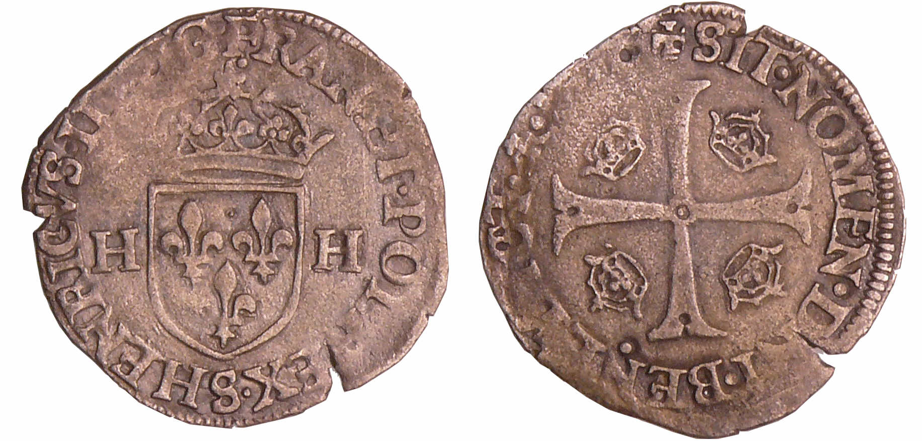 Avers : A/ HENRICVS III D G FRAN ET POL REX. Ecu de France couronné et accosté de deux H.