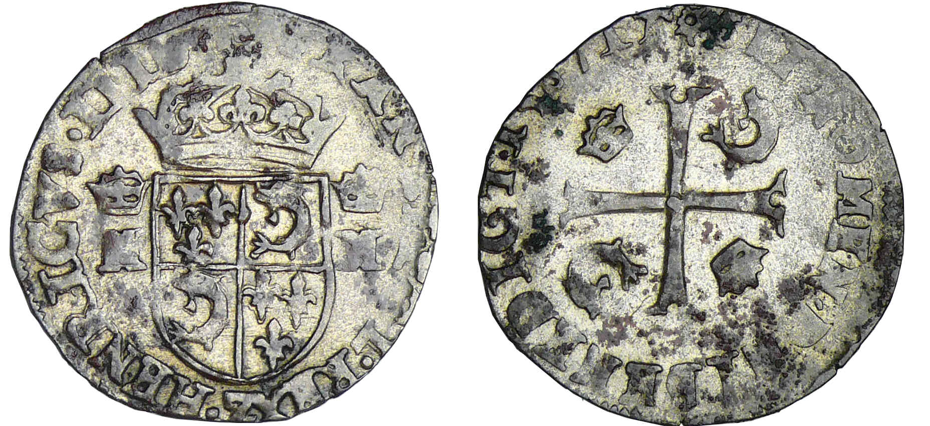 Avers : A/. HENRICVS. III. D. G. FRAN. ET. POL. REX. Ecu de France-Dauphiné couronné et accosté de deux H couronnés.