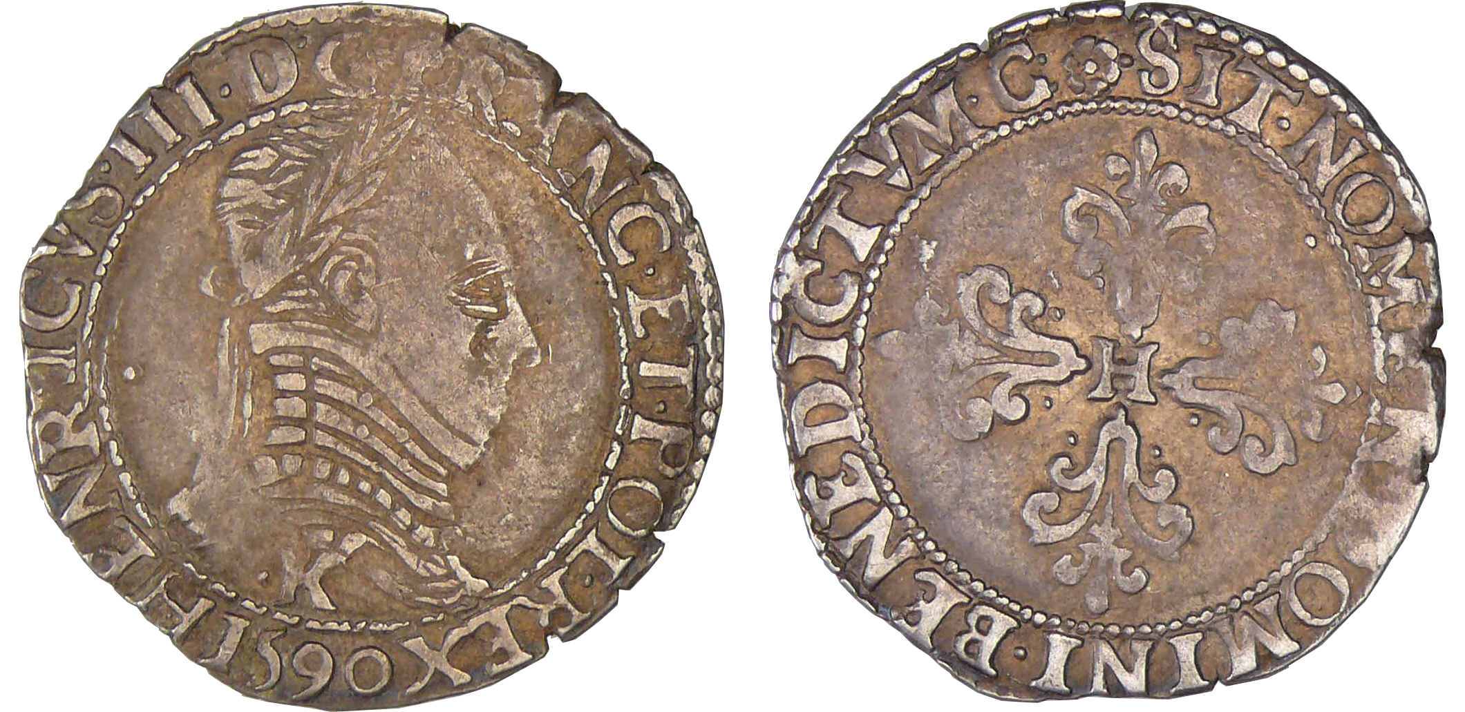 Avers : A/ .HENRICVS. III. D. G. FRANC. ET. POL. REX. Buste au col plat, lauré et cuirassé à droite (millésime). Lettre d’atelier sous le buste.
