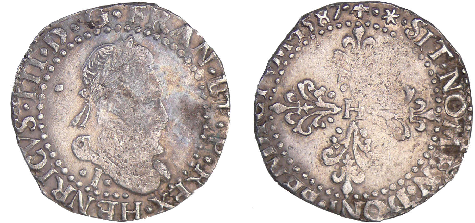 A/. HENRICVS. III. D. G. FRAN. ET. POL. REX. Buste au col plat, lauré et cuirassé à droite. Lettre d’atelier sous le buste.