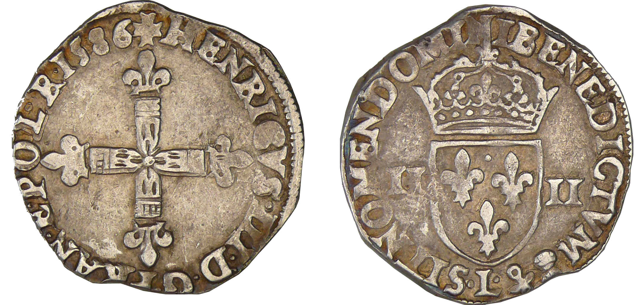 A/ + HENRICVS. III. D. G FRAN. ET. POL. R 1586. Croix fleurdelisée.