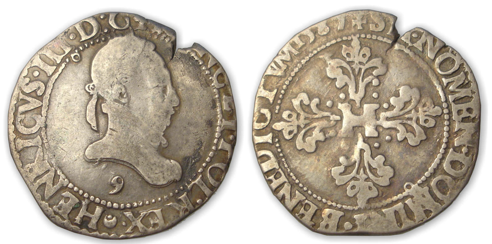 Avers : A/ + HENRICVS. III. D. G. F[RA]NC. ET. POL. REX (croissant) Buste lauré et cuirassé à droite, au col plat. Lettre d’atelier sous le buste.