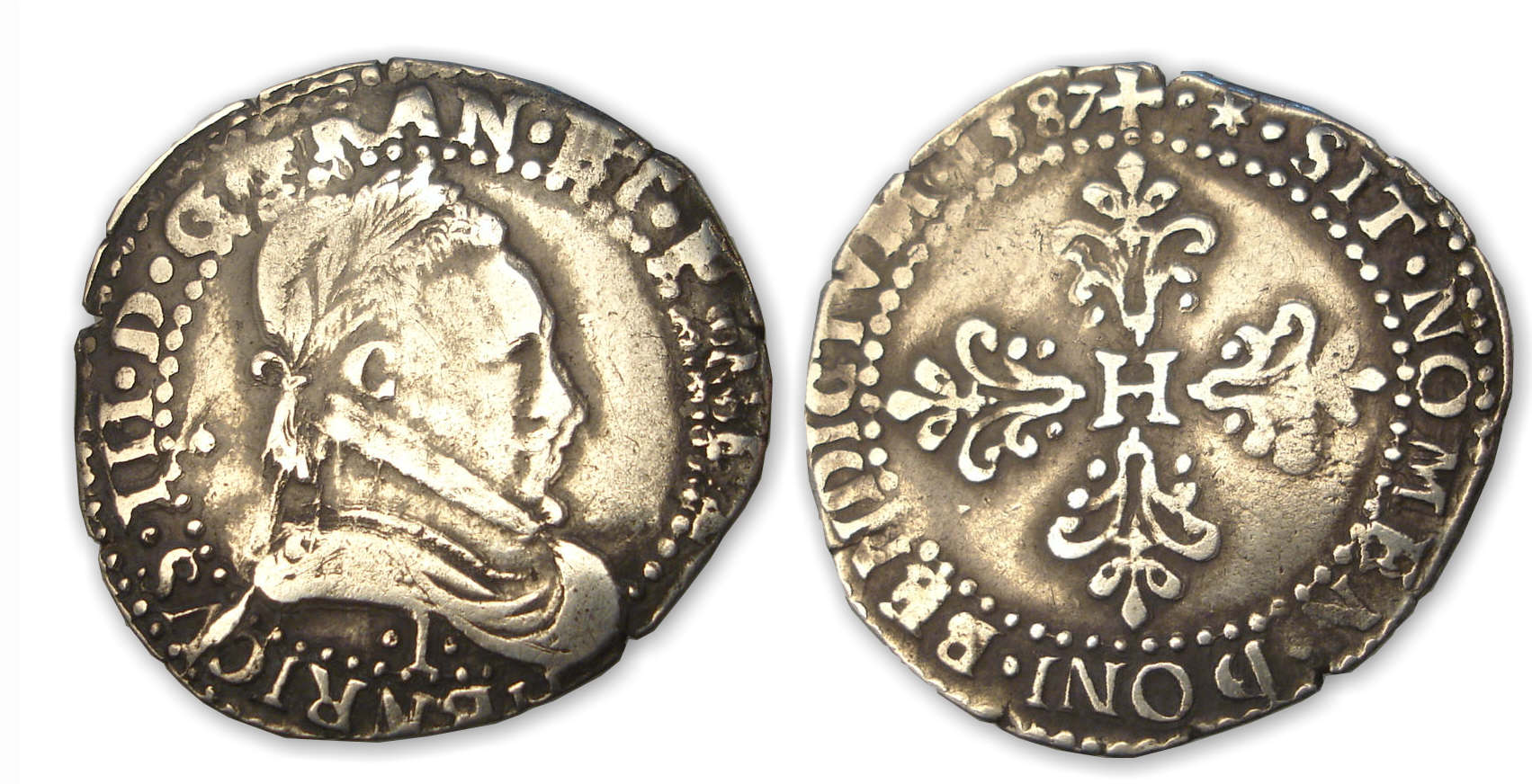 Revers : R/ + . (soleil). SIT. NOMEN. DONI. BENDICTVM. 1587 Croix formée d’un H en cœur et de quatre éléments feuillus et fleurdelisés.