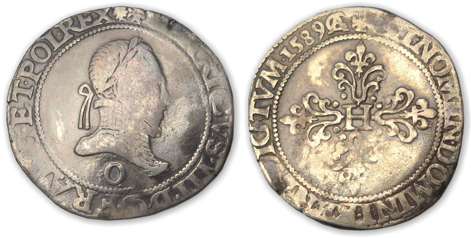 Avers : A/ + HENRICVS. III. D. G. FRANC. ET. POL. REX (soleil) Buste lauré et cuirassé à droite, au col plat. Lettre d’atelier sous le buste.
