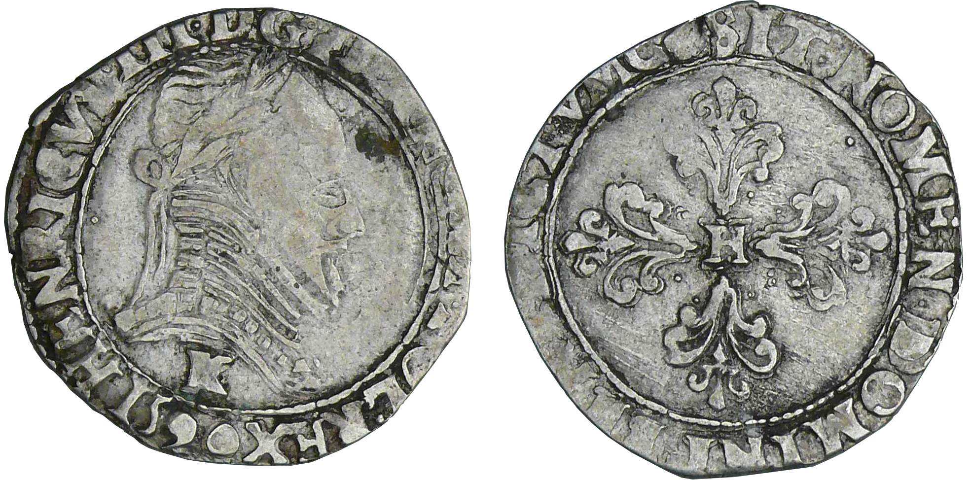 A/. HENRICVS. III. D. G. FRAN. ET. POL. REX Buste au col plat, lauré et cuirassé à droite. Lettre d’atelier sous le buste.