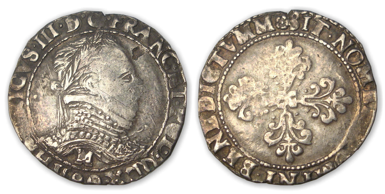Avers : A/ + HENRICVS. III. D. G. FRANC. ET. POL. REX 1590. Buste lauré et cuirassé à droite, au col plat. Lettre d’atelier sous le buste.