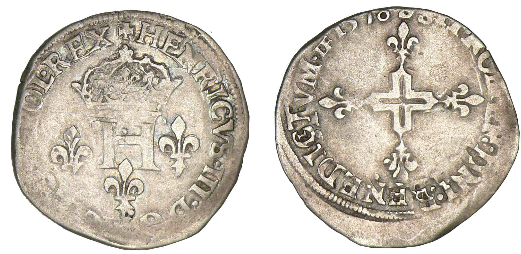 A/ HENRICVS III D G FRAN ET P REX (millésime). H couronné entre trois lis.